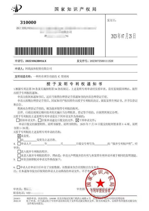 2023年7月25日,pa视讯流体控制有限公司(以下简称“AFA公司”)再获两项国家发明专利授权,这是继今年6月份《一种耐磨C型球阀》获得国家发明专利后的又一重大突破。这两项发明专利分别名为《一种球阀生产自动化喷漆设备》和《一种具有调节功能的C型球阀》。至此,AFA公司获得国家发明专利授权数已达到4项。